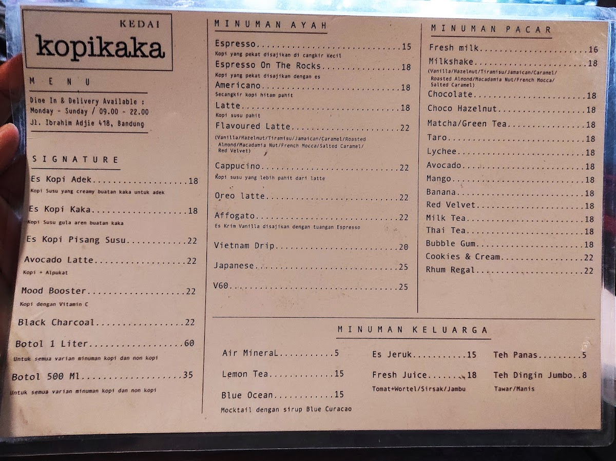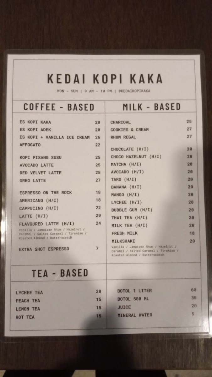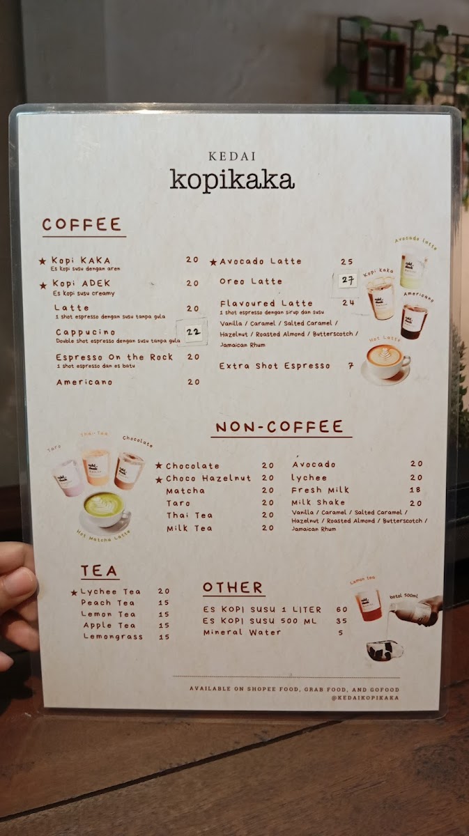 The menu boasts a delightful range of coffee options, including the popular Es Kopi Kaka, which is crafted with premium ingredients like gula aren and fresh milk for a smooth, creamy experience. Customers have noted the harmonious sweetness that perfectly complements the coffee's depth, though some feel the balance could be further enhanced.